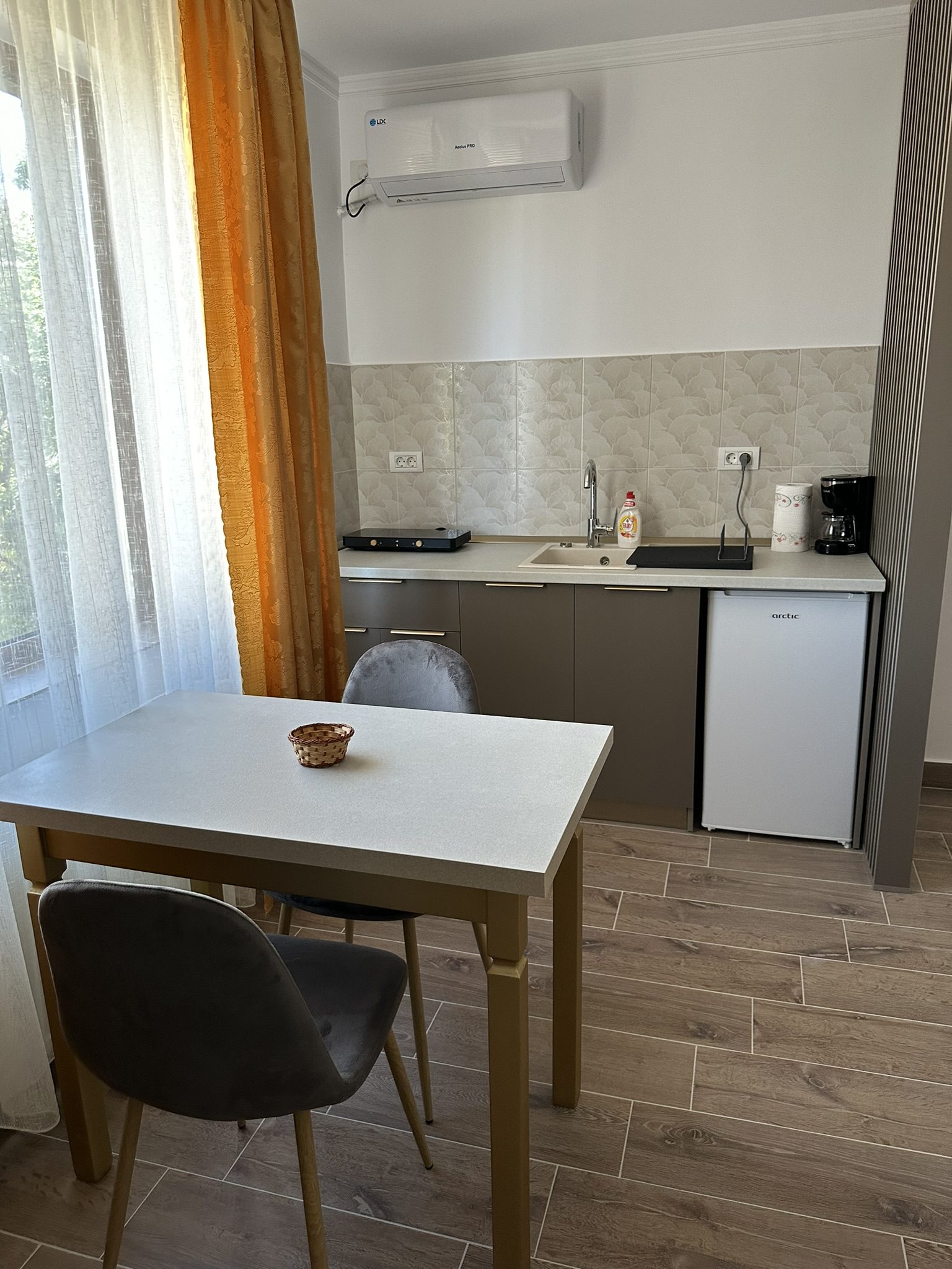 Garsoniera cocheta si eleganta, dotata cu tot confortul necesar pentru o vacanta relaxanta la mare. Situata intr-o zona linistita, la doar 10 minute de centrul orasului si 15 minute de plaja. Wi-Fi gratuit, Smart TV cu Netflix, aer conditionat si o bucatarie complet utilata. In plus, dispune de un loc de gratar pentru cinele in aer liber si un loc de joaca pentru copii.