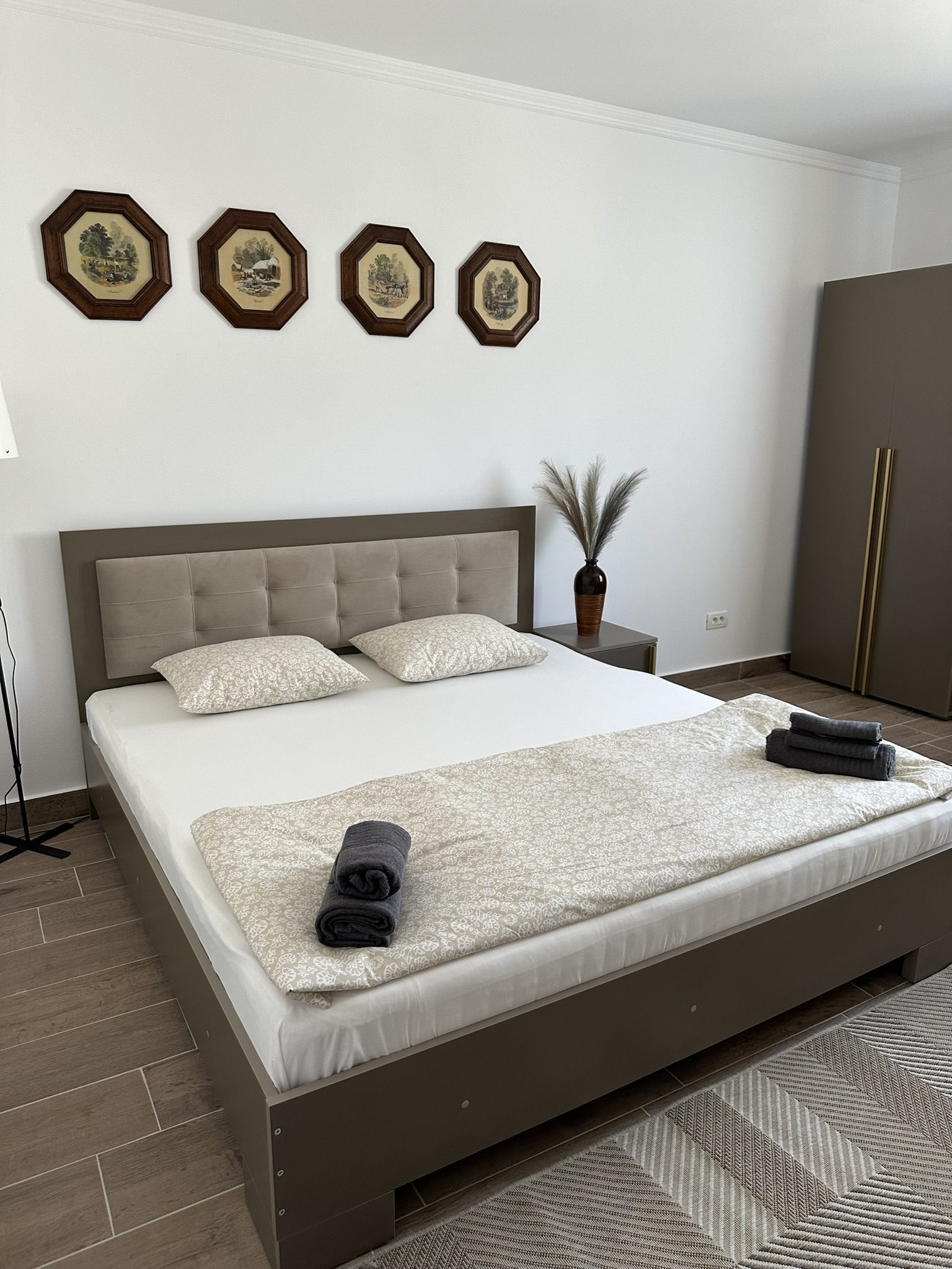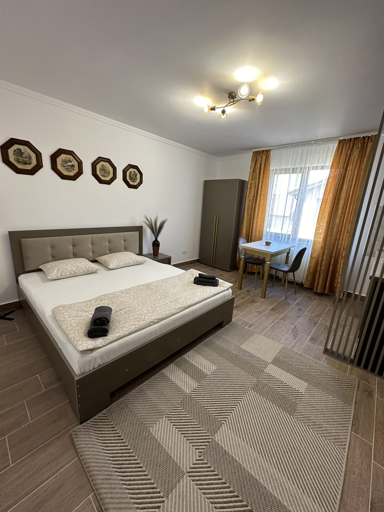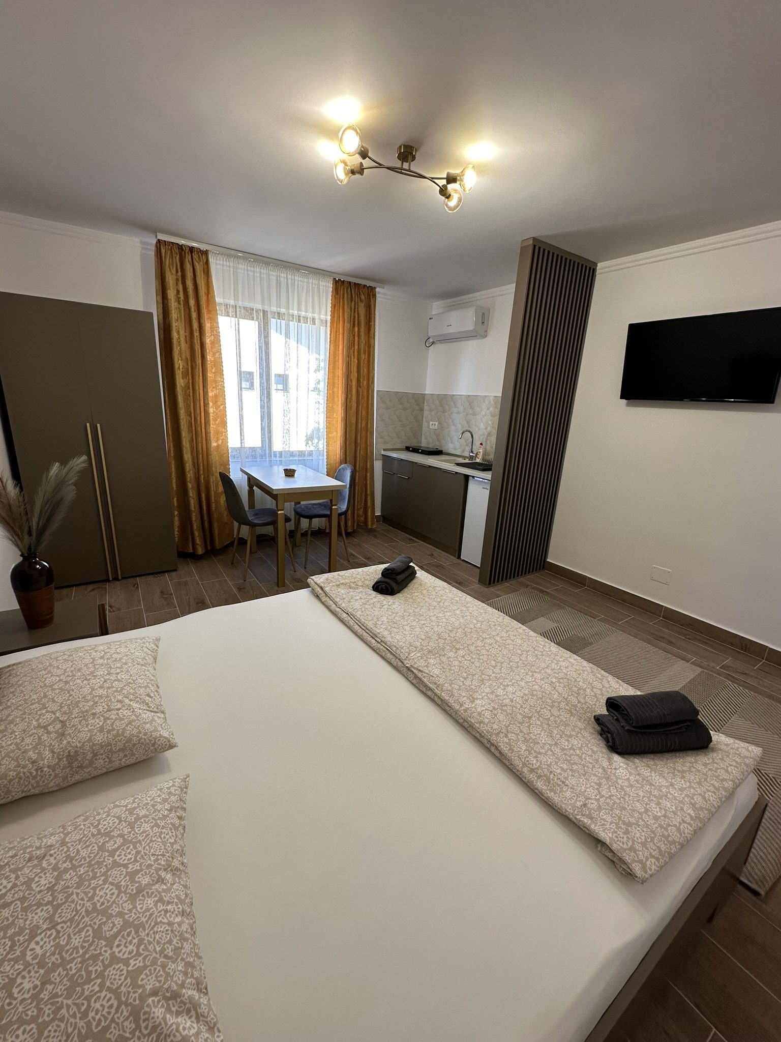- Dormitor: Patul are dimensiunea 180/200 cm, fiind potrivit pentru o familie cu un copil sau un cuplu. Televizorul Smart este conectat la internet si Netflix.